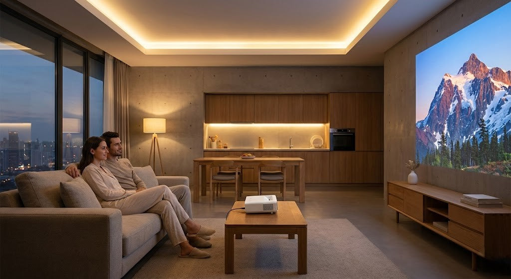 Transforme sua parede em uma tela de 130 polegadas. Streaming nativo, qualidade 4K e design compacto