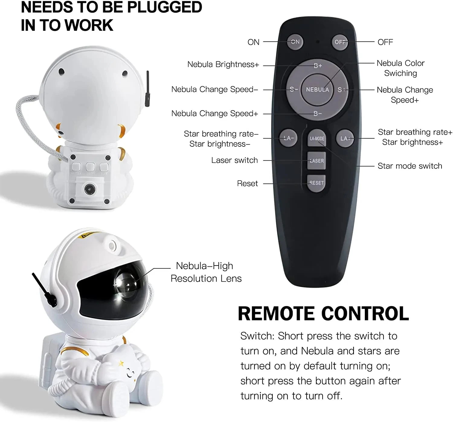 Projetado na forma icônica de um astronauta, ele projeta nebulosas em alta definição e milhares de estrelas laser, criando um ambiente que hipnotiza, acalma e inspira.